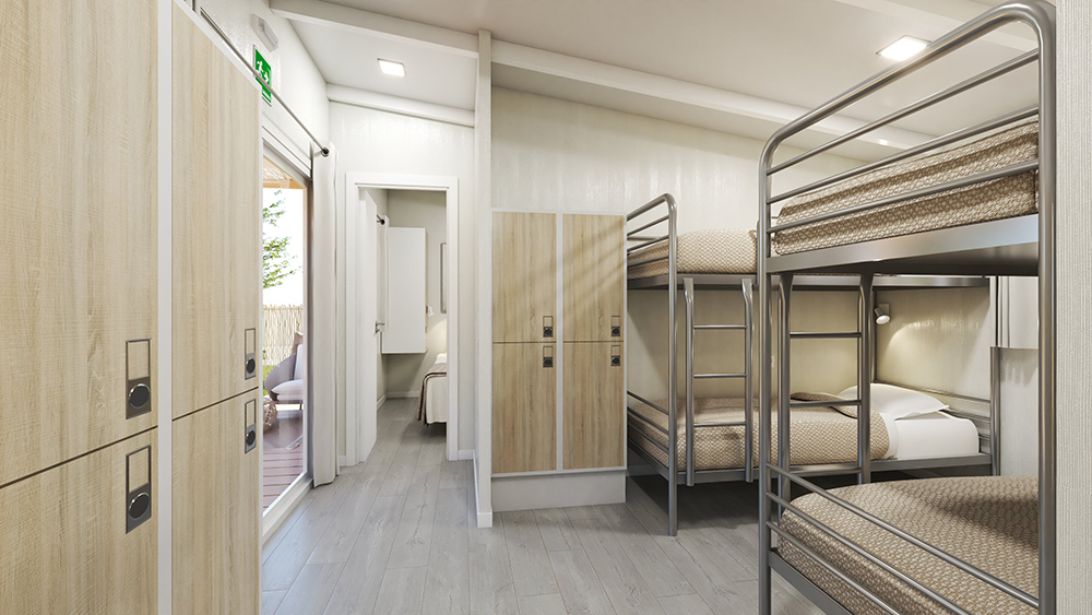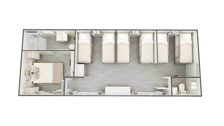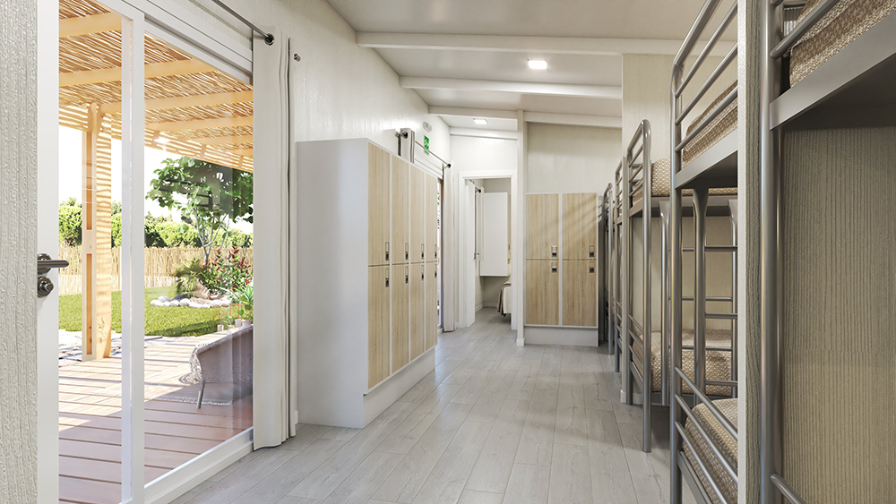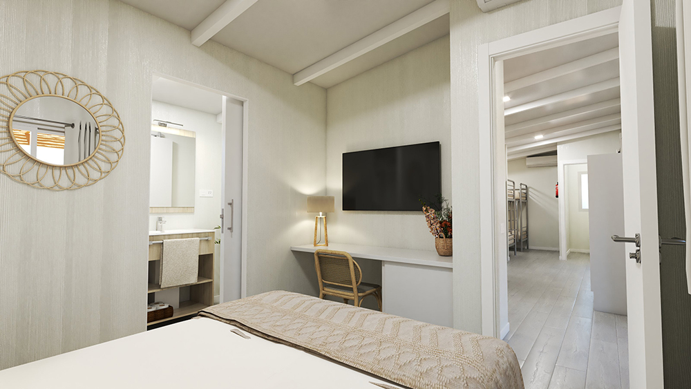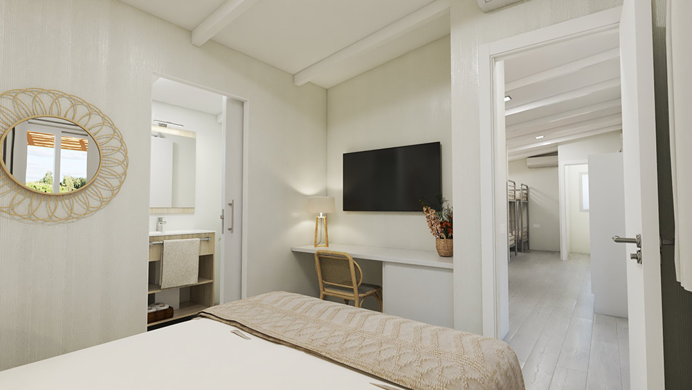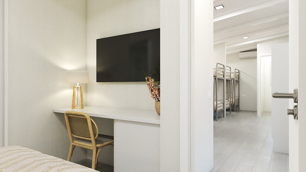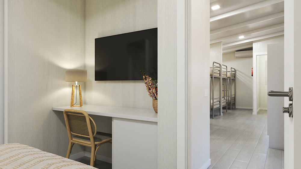 El albergue C cuenta con una distribución ideal para el alquiler de estudiantes con monitor. Una zona común diáfana con 6 literas y aseo, y una segunda zona privada con dormitorio con baño en suite para. Ideal para mantener la privacidad pero estar al lado.