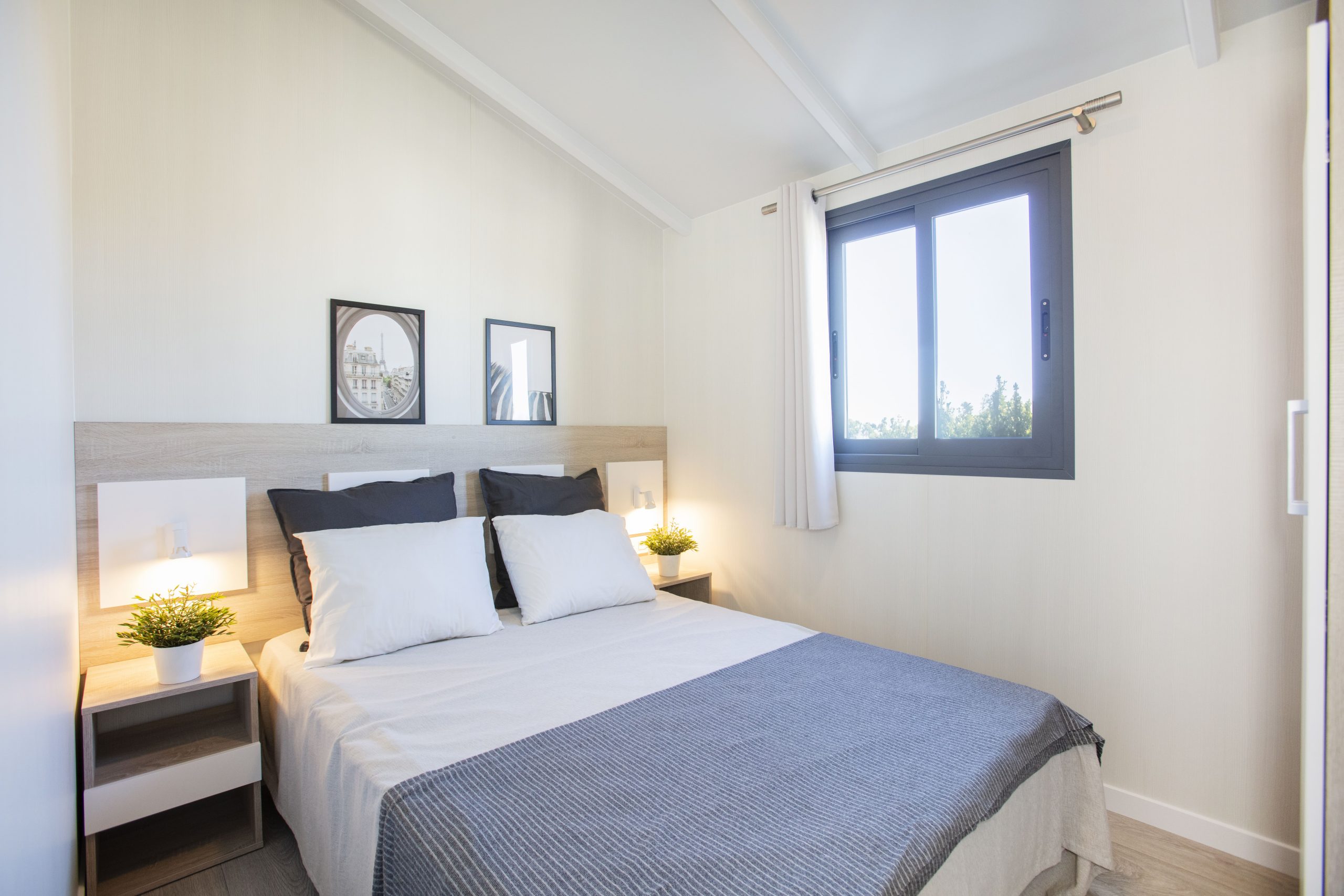 - Dormitorio principal: cama de 135 x 190 cm con base tapizada, cabezal, mesitas de noche con luces de lectura y gran armario empotrado con puertas correderas.