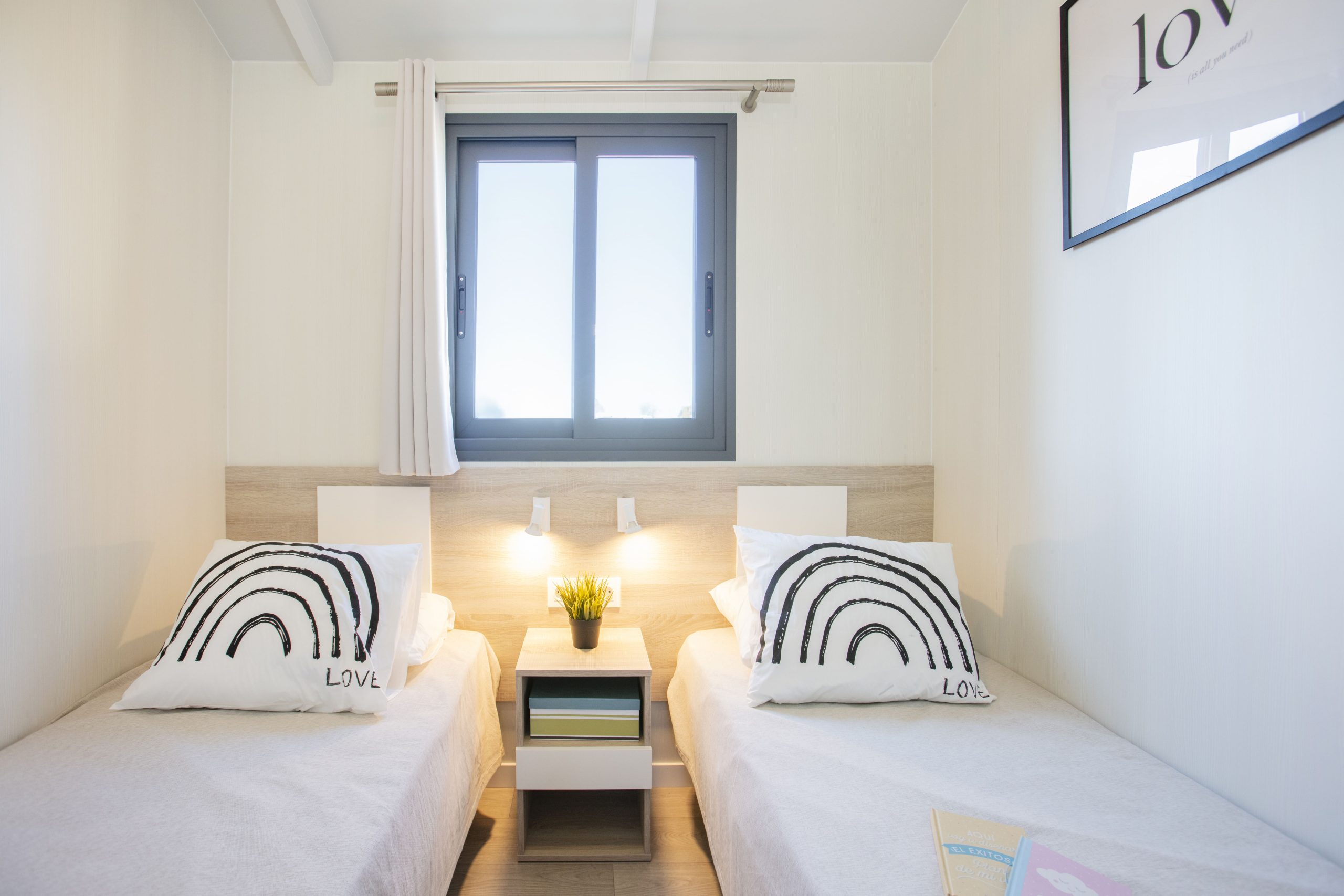 - Dormitorio individual: dos camas paralelas de 80 x 190 cm, cabezales, mesita central, puntos de luz y armario.