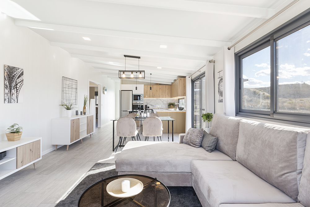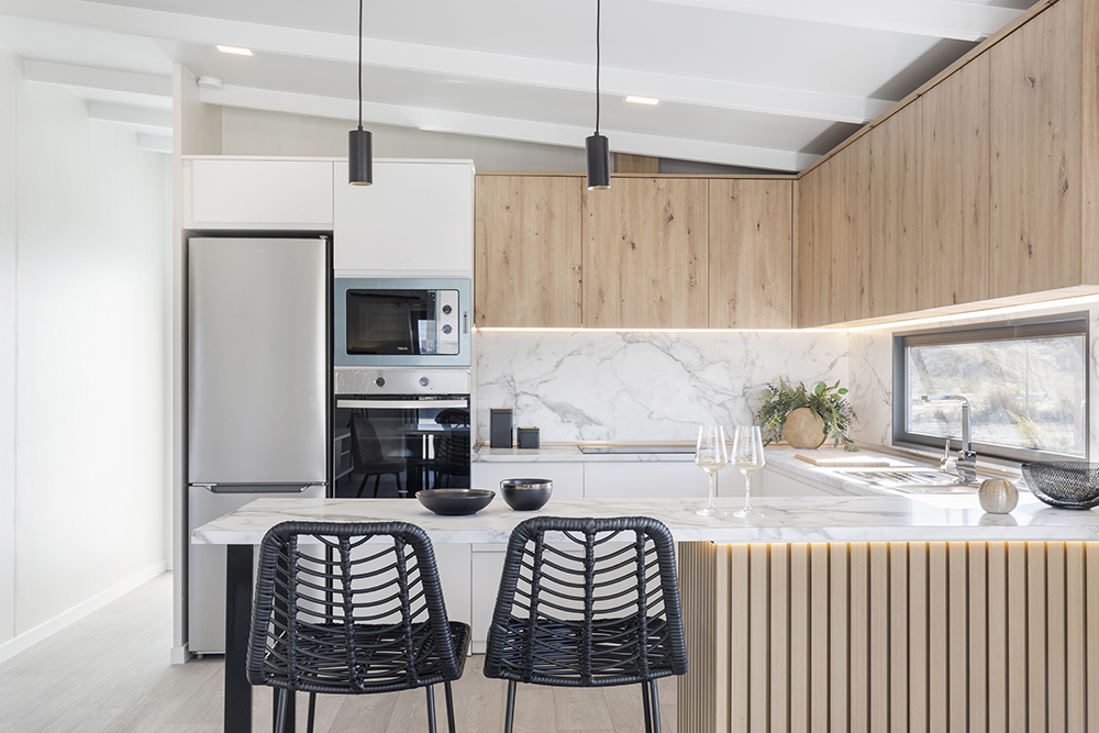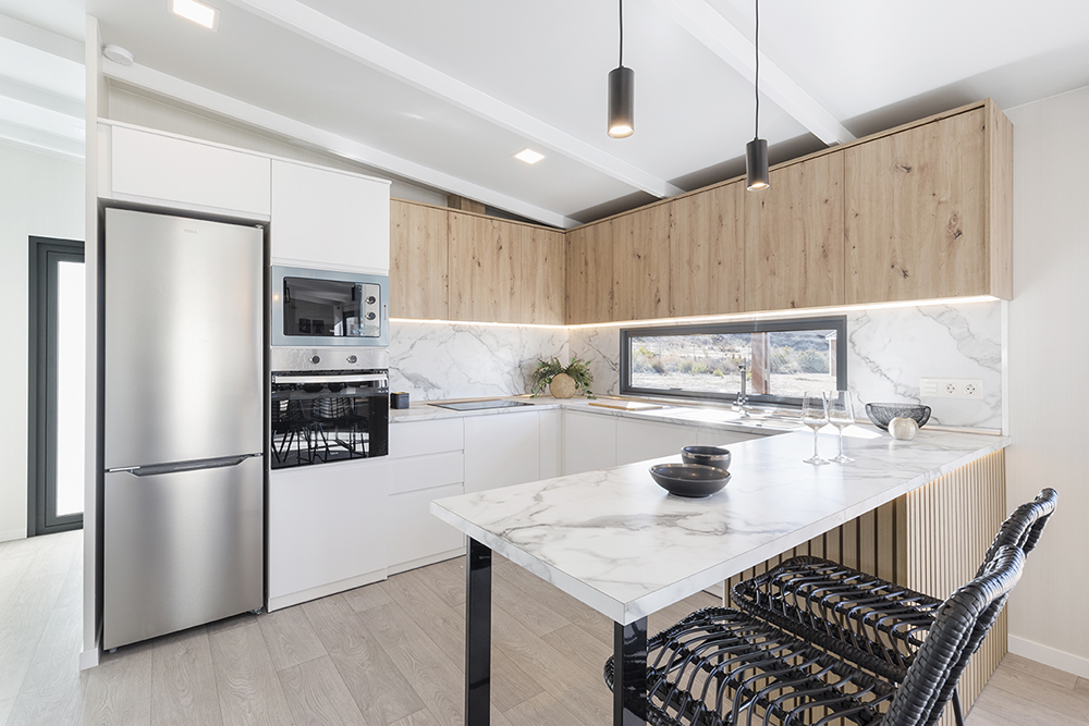 - Cocina: Moderna y compacta, con luces LED indirectas, frigorífico-congelador combi, horno eléctrico y microondas empotrados. Encimera con vitrocerámica de 3 fuegos, barra alta con 2 taburetes y ventanal fijo para mayor luz natural.
