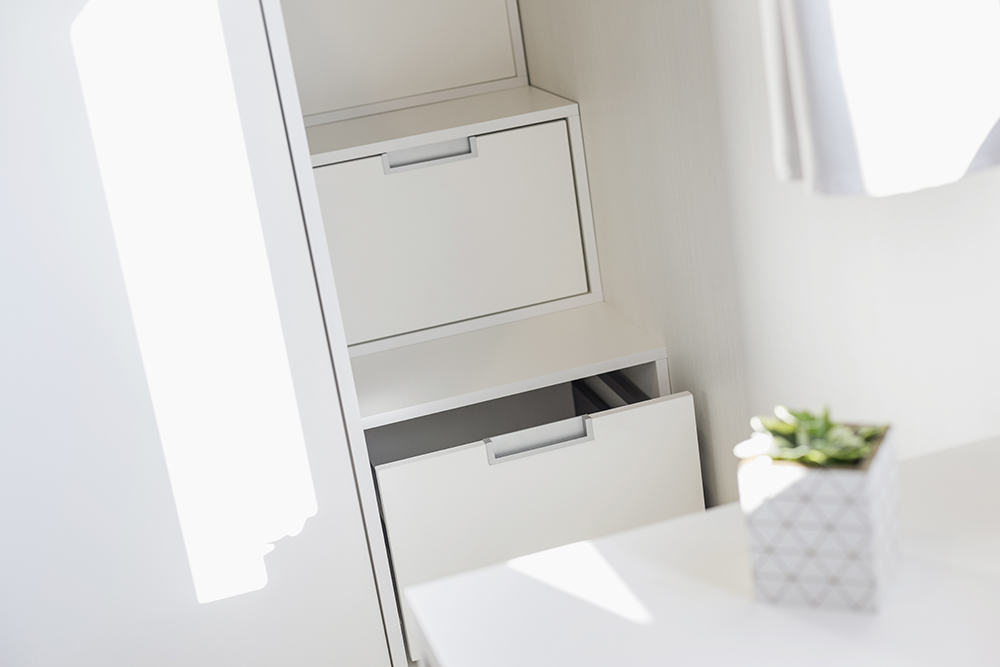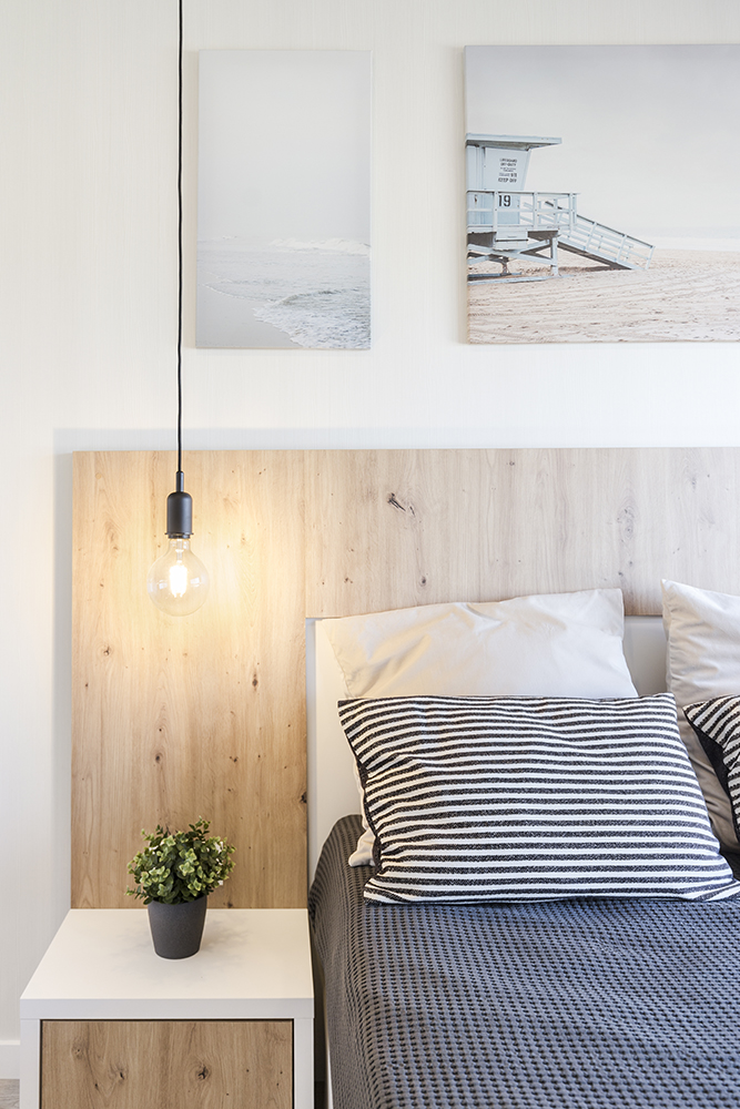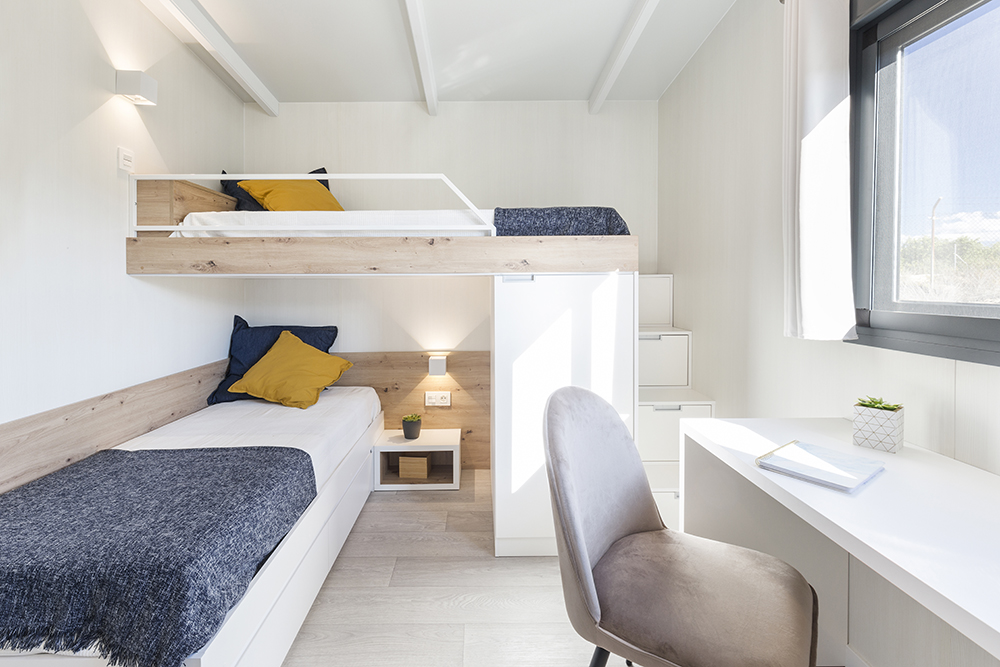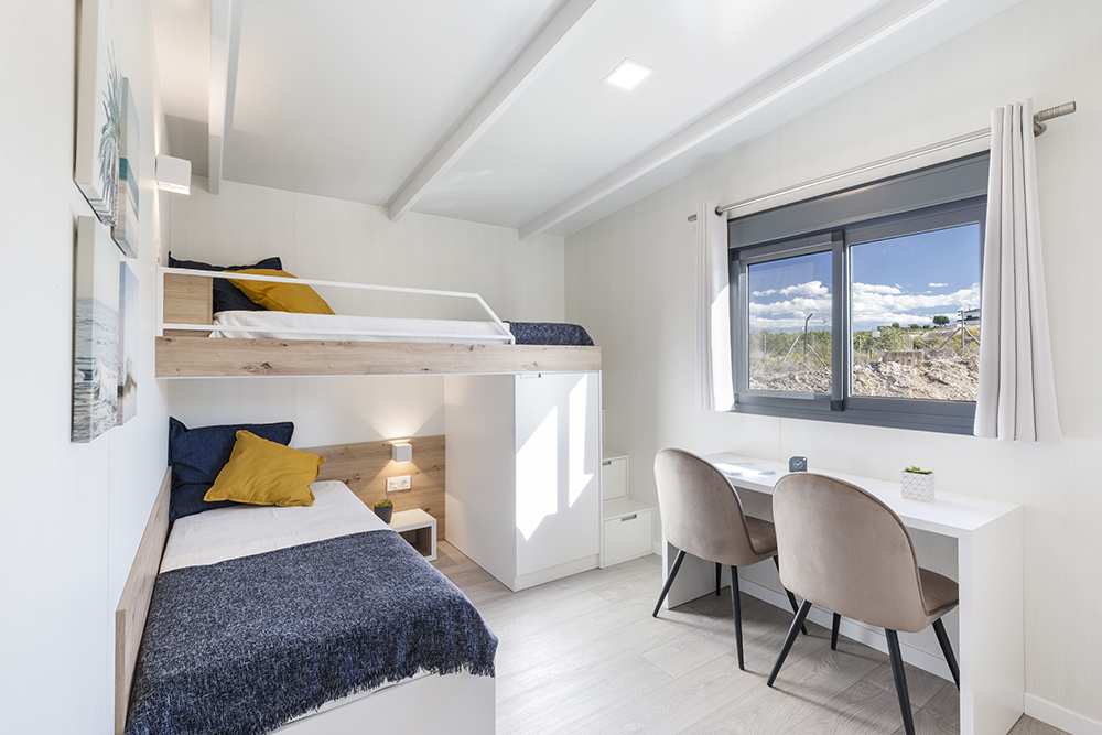 - Dormitorios individuales: Camas con cajones incorporados, escritorio con silla a juego con las del comedor y armario de almacenamiento.