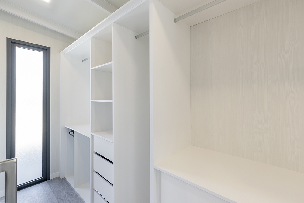 - Dormitorio principal: Cama con canapé de 150 x 200 cm, cabezal con lámparas colgantes de diseño y armario vestidor con cajoneras, baldas y barras para colgar ropa.