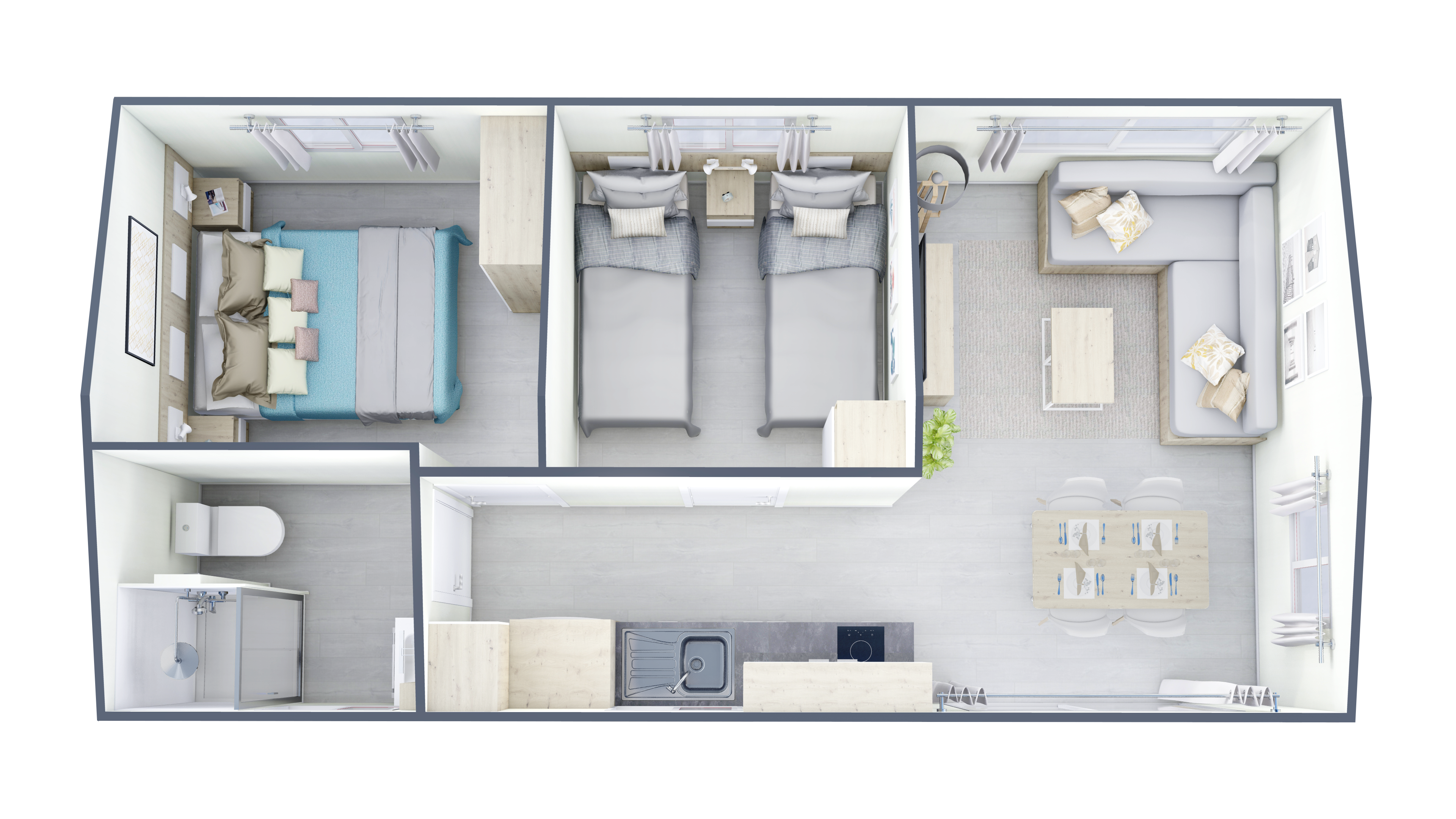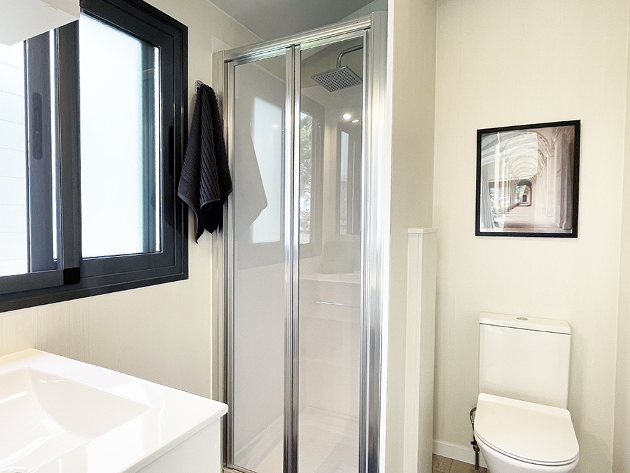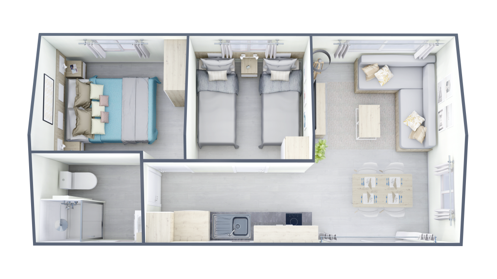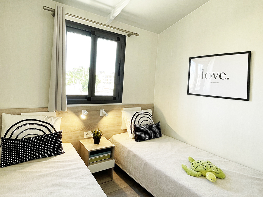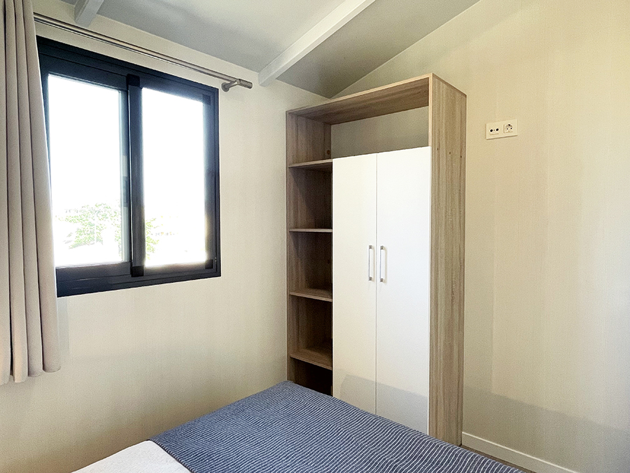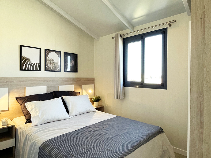 Este modelo de dos habitaciones, es ideal para familias. Destaca por sus grandes espacios, gracias a un espectacular salón, su equipada y práctica cocina y un dormitorio principal de gran tamaño. Su distribución, permite dividir la zona de estar de la zona