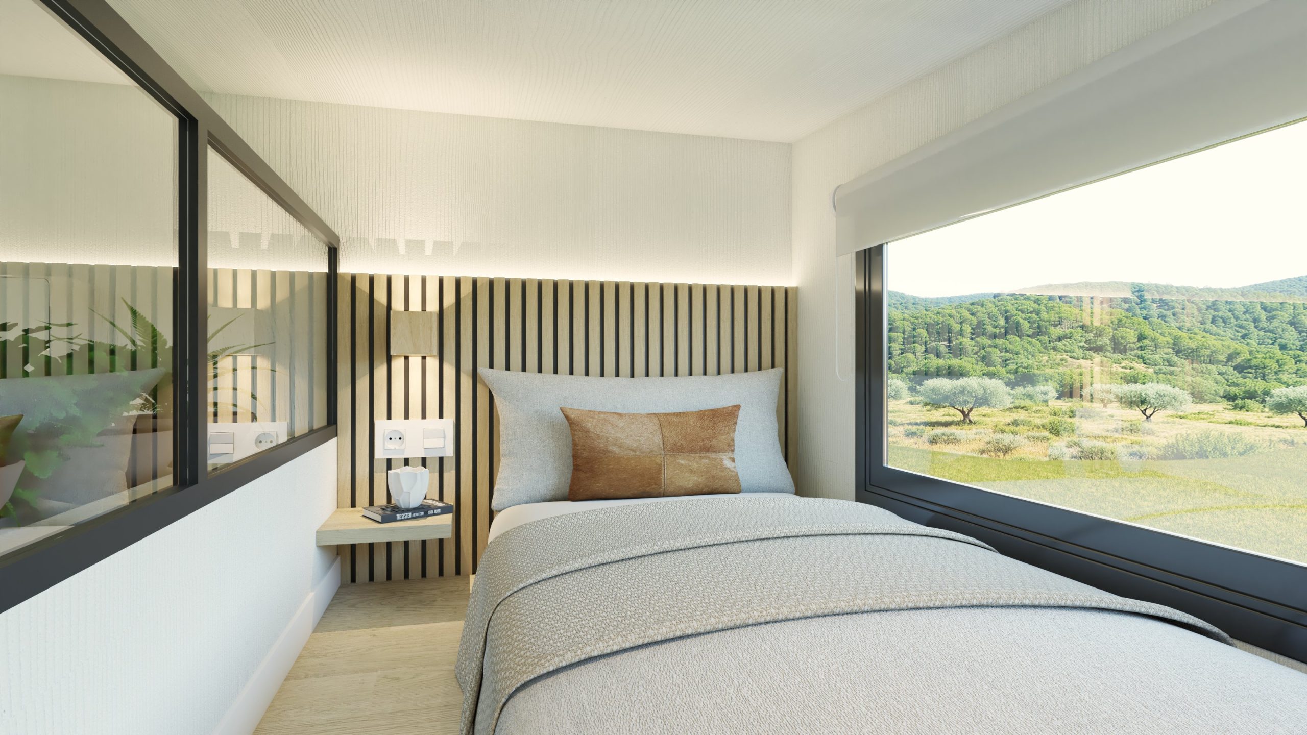 - Dormitorio individual: Cama de 80 x 190 cm con somier con almacenaje y colchón HR hipoalergénico.